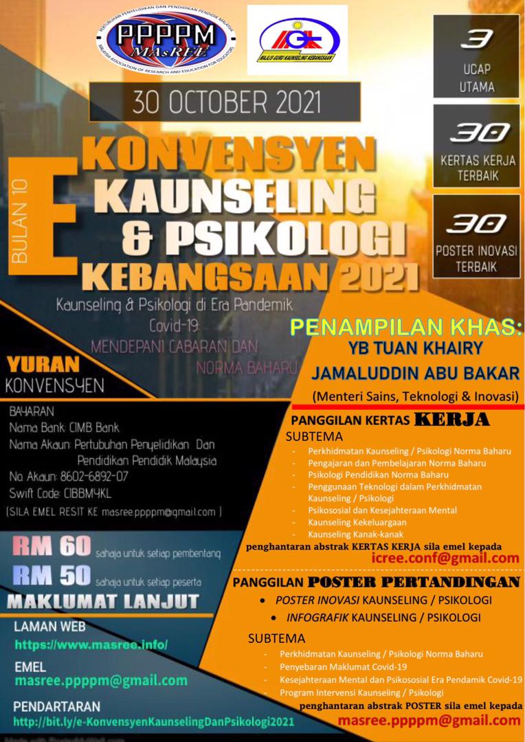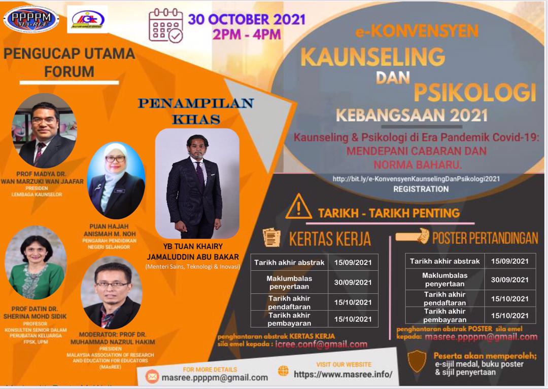 Sukacita dimaklumkan bahawa Malaysia Association of Research and Education for Educators (MAsREE) dan Majlis Guru Kaunseling Selangor akan menganjurkan e-Konvensyen Kaunseling dan Psikologi Kebangsaan 2021 pada 30 Oktober 2021, (Sabtu) melalui webinar.