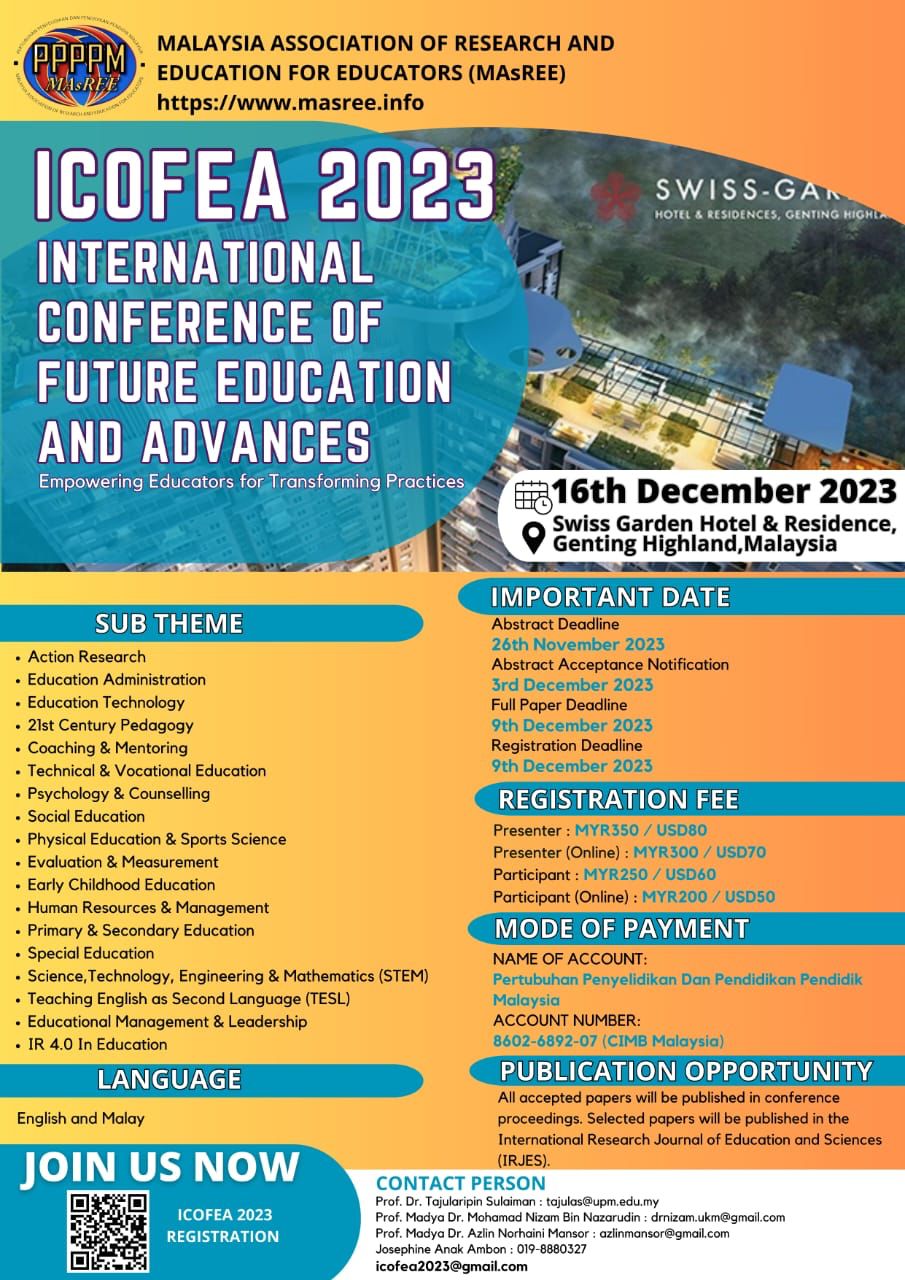CALL FOR PAPER WITH PUBLICATION OPPORTUNITY (IRJES) AND PARTICIPATION: INTERNATIONAL CONFERENCE OF FUTURE EDUCATION AND ADVANCES 2023 (ICOFEA 2023) WITH THE THEME “EMPOWERING EDUCATORS FOR TRANSFORMING PRACTICES”