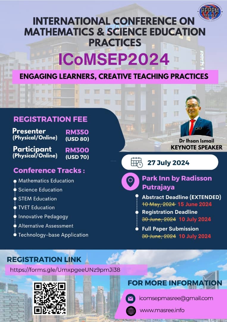 We are pleased to inform you that the Malaysia Association of Research and Education for Educators (MAsREE) is organizing the International Conference on Mathematics & Science Education Practices (ICoMSEP) 2024 on 27th July 2024, (Saturday) in Park Inn by Radisson, Putrajaya. This year ICoMSEP 2024 will be held in hybrid mode (physical & online). Looking forward to seeing you at ICoMSEP 2024!