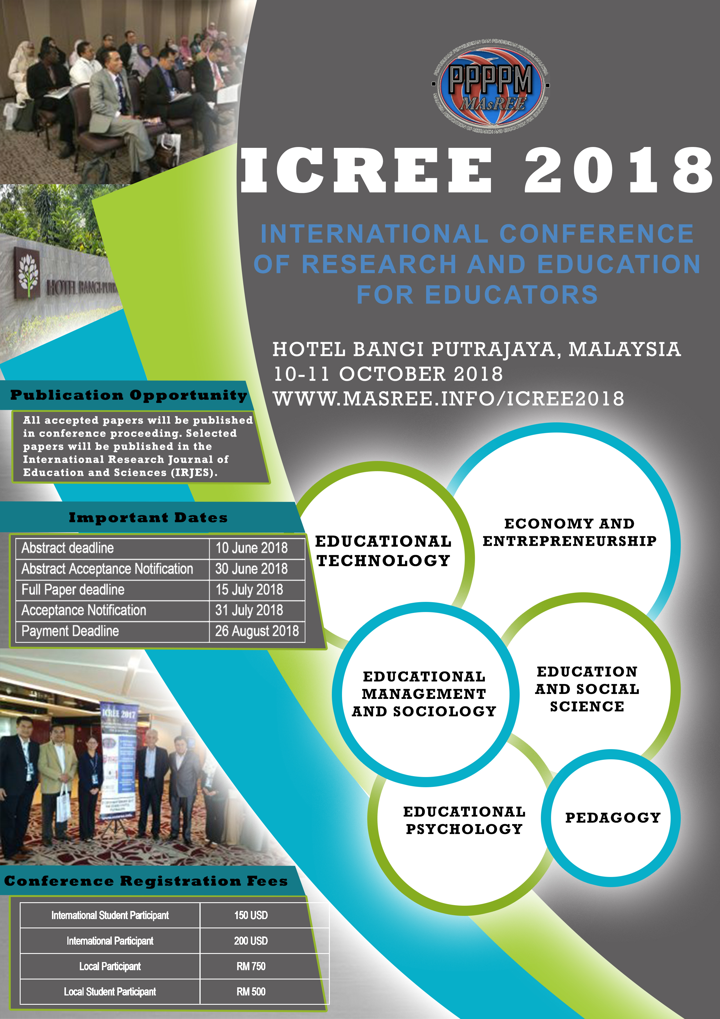 The International Conference of Research and Education for Educators (ICREE) 2018 is organized by the Malaysia Association of Research and Education for Educators (MAsREE). This conference will be held at Hotel Bangi-Putrajaya, Malaysia on the 10th and 11th of Oktober 2018. The ICREE 2018 Organising Committee is pleased to invite academicians, researchers, educators, postgraduate students and practitioners to participate in this conference.