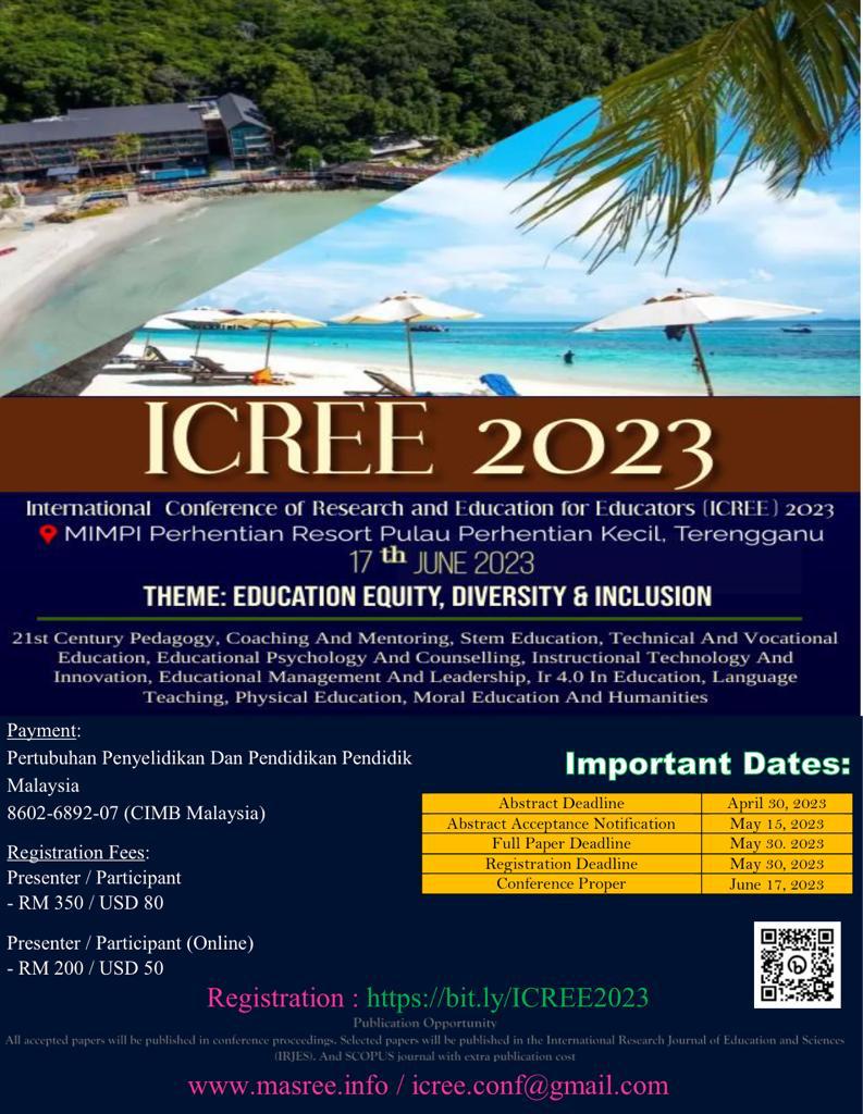 MAsREE is hosting the International Conference of Research and Education for Educators (ICREE) 2023 in MIMPI Perhentian Resort, Pulau Perhentian Kecil, Terengganu, Malaysia on Saturday, June 17th, 2023.